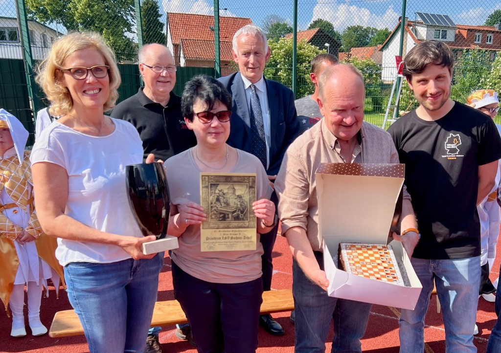 Am 1. Juni fand das 60. Ströbecker Schachturnier statt, ein Traditionsturnier eingebettet in das Ströbecker Dorffest. Bereits 1960 fand das erste Turnier statt mit 6 teilnehmende Mannschaften und 5 Runden bei 30min Bedenkzeit pro Spieler und Partie- ein voller Erfolg wie in der Chronik steht. Seither findet das Turnier immer im Mai - mit Ausnahme der Corona Pause- statt. Die steigende Teilnehmerzahl machte die Aufteilung in Gruppen und Verkürzung der Bedenkzeit erforderlich.